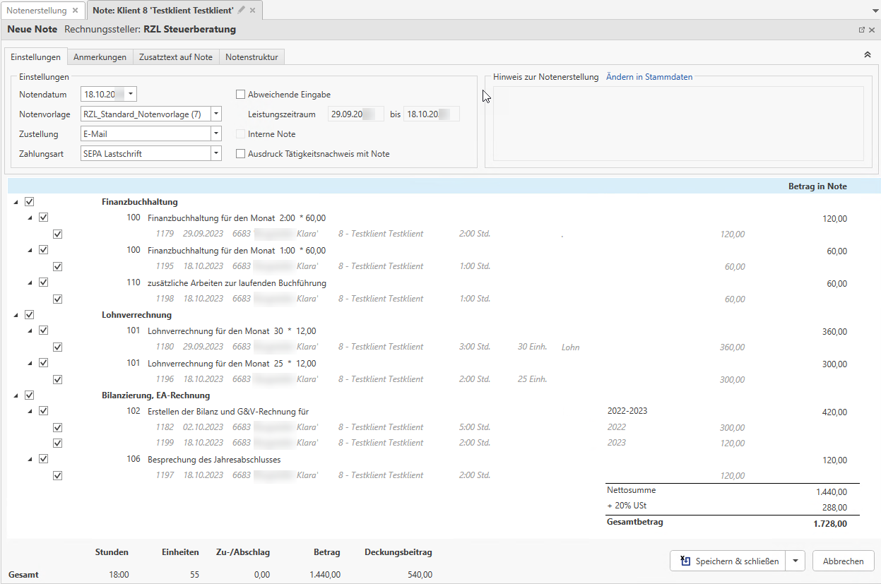 Wenn Sie beispielsweise in den Grundeinstellungen automatische Verteilung ohne Mitarbeiterbezug eingestellt haben und Sie in der Note einen Zuschlag machen, wird dieser Zuschlag auf den Klienten verteilt.