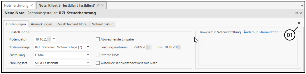 Als Zahlungsart wird die beim Klienten in den Stammdaten hinterlegte Zahlungsart angezeigt. Möglich sind Überweisung, SEPA-Lastschrift und keine Zahlung. Die Zahlungsart kann ebenfalls während der Notenerstellung geändert werden.