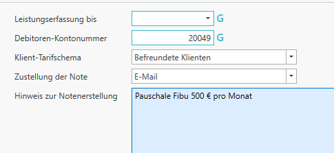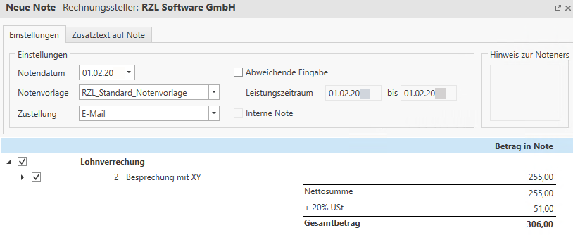 Im Reiter Zusatztext für Note, wird jener Text angedruckt, der in den Stammdaten des Klienten hinterlegt wurde. Während der Notenerstellung kann dieser Text ergänzt bzw. editiert werden. Dieser Text wird auf der Note angedruckt.