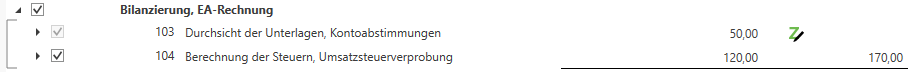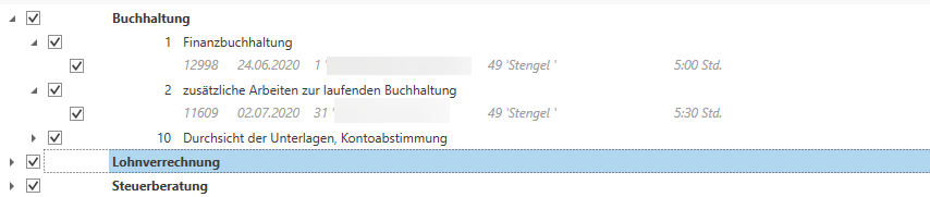 Es wurde eine Gruppierung auf die Tätigkeiten Finanzbuchhaltung, zusätzliche Arbeiten zur laufenden Buchhaltung und Durchsicht der Unterlagen, Kontoabstimmung gesetzt.