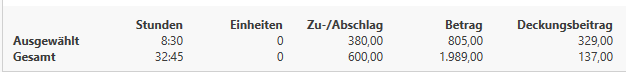 Im unteren Bereich wird Ihnen eine Infozeile angezeigt. Diese beinhaltet die Stunden, Einheiten, Zu-/Abschläge, den Betrag und den Deckungsbeitrag.