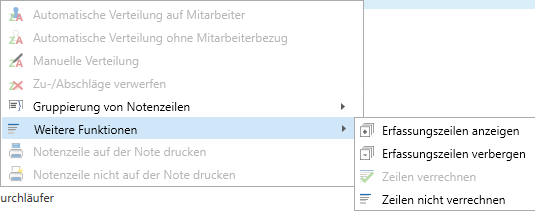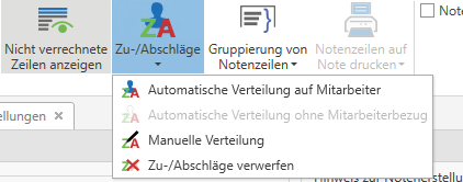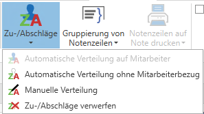 Grundsätzlich wird während der Notenerstellung jene Verteilung verwendet, die Sie in den Grundeinstellungen definiert haben. Sie können jedoch den jeweiligen Zu-/Abschlag jederzeit anders verteilen. Dazu gibt es während der Notenerstellung mehrere Möglichkeiten. Sie können entweder über den Button Zu-/Abschläge im Ribbon oder über das Kontextmenü, mit der rechten Maustaste, die Variante ändern.