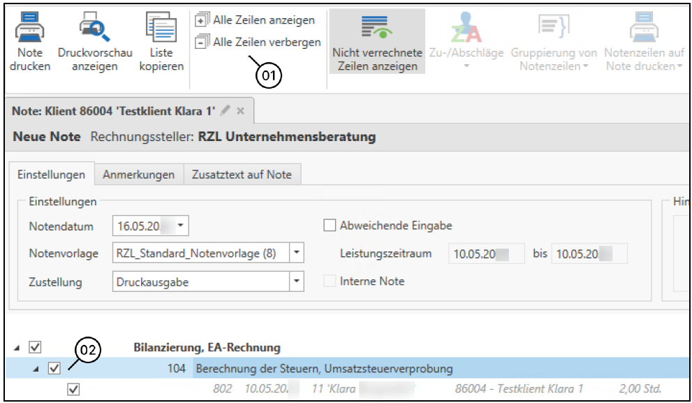 Sollten Ihnen Leistungszeilen bei der Notenerstellung fehlen, stellen Sie sicher, dass Sie nicht versehentlich diese Leistungen von der Verrechnung ausgeschlossen haben, indem Sie sich die nicht verrechneten Zeilen einblenden.