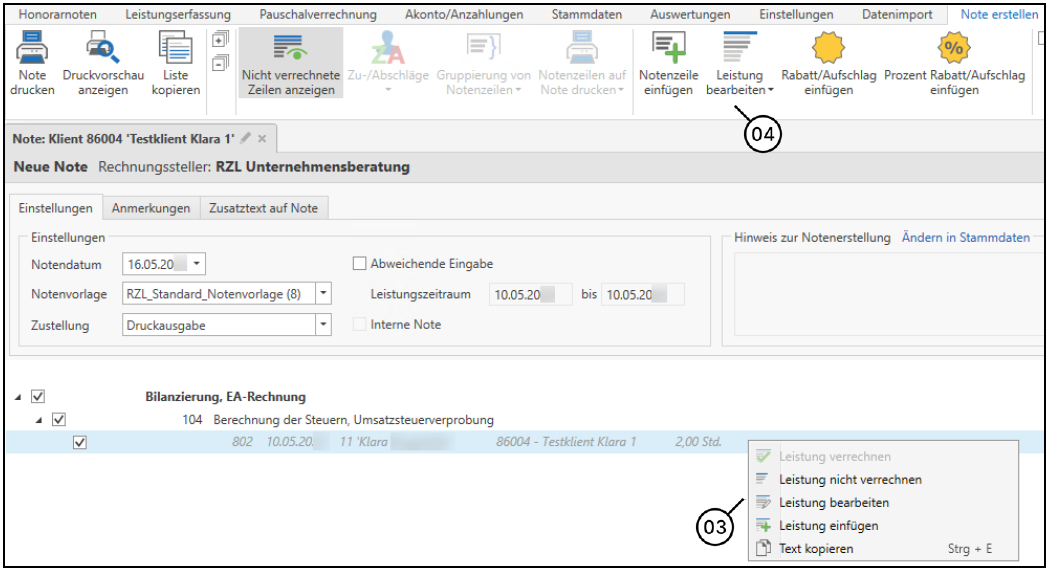 und mit der rechten Maustaste (3) oder mit Leistung bearbeiten