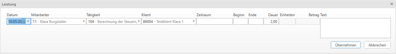 Innerhalb der Leistungserfassung der Mitarbeiter besteht die Möglichkeit, einen Text für die Honorarnote zu erfassen. Hierfür wird im Textfeld der zu übernehmende Text markiert.