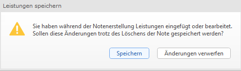 Werden alle Leistungen umgebucht, sodass eine Leere Note entsteht, kann diese nicht gespeichert werden. Beim Abbrechen der Notenerstellung erhalten Sie die Abfrage, ob die getätigten Änderungen an den Erfassungszeilen dennoch gespeichert werden sollen.