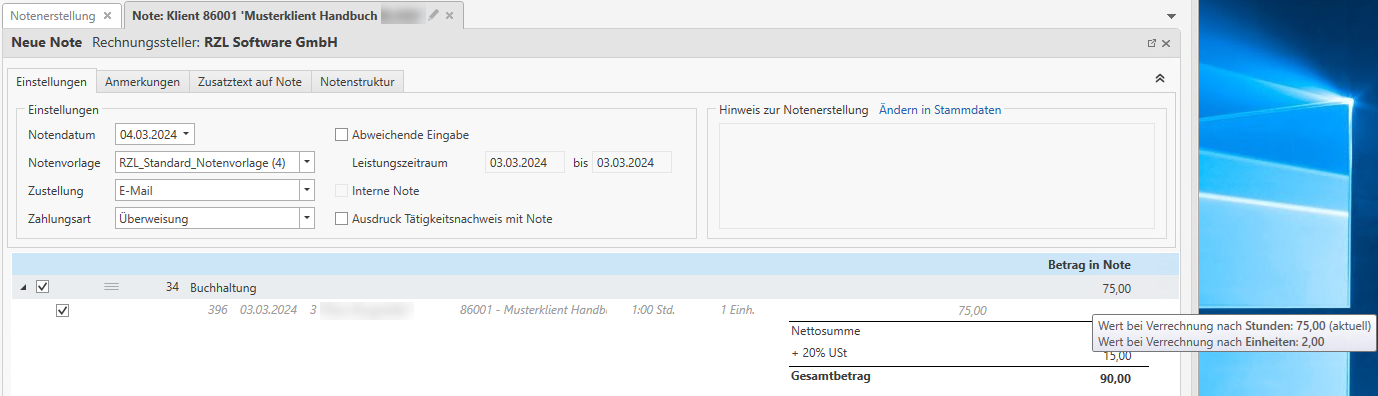 Bei Tätigkeiten mit der Verrechnungsart Einheiten kann während der Notenerstellung ebenso auf Verrechnung nach Stunden gewechselt werden, sofern in den Stammdaten der Tarifschemata ein Einheiten- und Stundensatz hinterlegt ist.