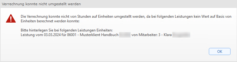 Wurden bei der Leistungserfassung keine Einheiten eingetragen, erhalten Sie folgenden Hinweis vom Programm. Solange keine Einheiten erfasst sind, kann die Verrechnung nicht gewechselt werden.