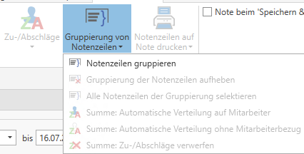 Sollen mehrere Notenzeilen zu einer gemeinsamen Zeile gruppiert werden, so ist dies entweder über die Schaltfläche Gruppierung von Notenzeilen im Ribbon oder über das Kontextmenü mit der rechten Maustaste möglich. Dazu müssen Sie die Leistungen die Gruppiert werden sollen markieren und die entsprechende Schaltfläche auswählen.