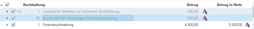 Die Tätigkeiten zusätzliche Arbeiten zur laufenden Buchhaltung und Durchsicht der Unterlagen, Kontoabstimmung sollen nicht auf der Honorarnote aufscheinen. Alles soll unter der Tätigkeit Finanzbuchhaltung aufscheinen. Die Finanzbuchhaltung wurde mittels Drag & Drop an die letzte Stelle gesetzt, da der Gesamtbetrag der Gruppierung immer bei der letzten Tätigkeit hinzugefügt wird. Die Tätigkeiten mit der Nummer 2 und 10 wurden über den Button Notenzeilen auf Note drucken – Notenzeile nicht auf der Note drucken deaktiviert. Somit wird der Gesamtbetrag nur mit der Tätigkeit Finanzbuchhaltung angedruckt.