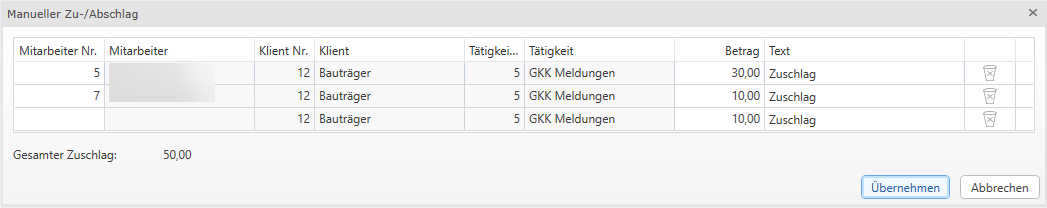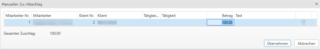 Beim manuellen Zuschlag/Abschlag können Sie selbst entscheiden wie der Betrag verteilt wird. Es öffnet sich ein Eingabefenster in welchem Sie die Beträge entweder auf Mitarbeiter, oder auf Klienten oder beides, wie in der nachfolgenden Abbildung, verteilen können.
