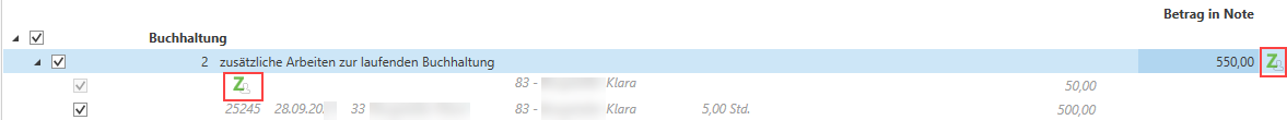 Wird auf eine nicht verrechenbare Tätigkeit umgebucht, ist diese Erfassungszeile nicht mehr in der Note ersichtlich.