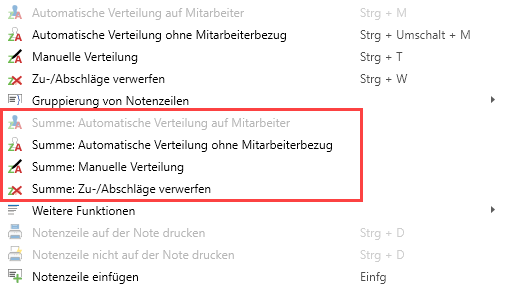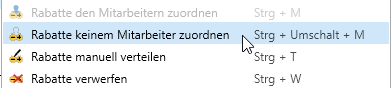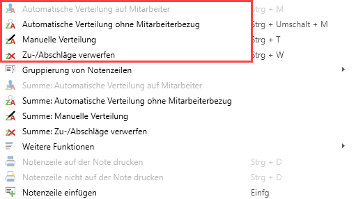 Rabatte/Aufschläge werden, je nach den getroffenen Grundeinstellungen, mit oder ohne Mitarbeiterbezug verteilt. Sollte diese Einstellung innerhalb der Notenerstellung abgeändert werden, kann dies über das Kontextmenü (rechte Maustaste auf die Rabatt-/Aufschlagszeile) erfolgen.