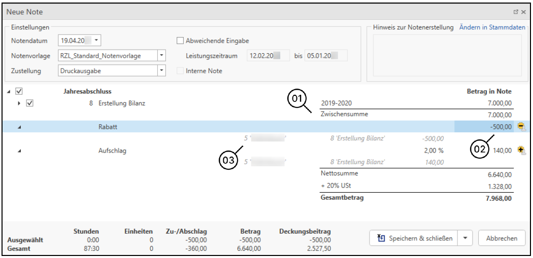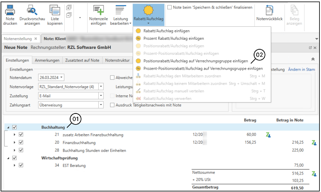 Der Rabatt/Aufschlag wird dann unterhalb der Tätigkeit/Verrechnungsgruppe (3) eingefügt.