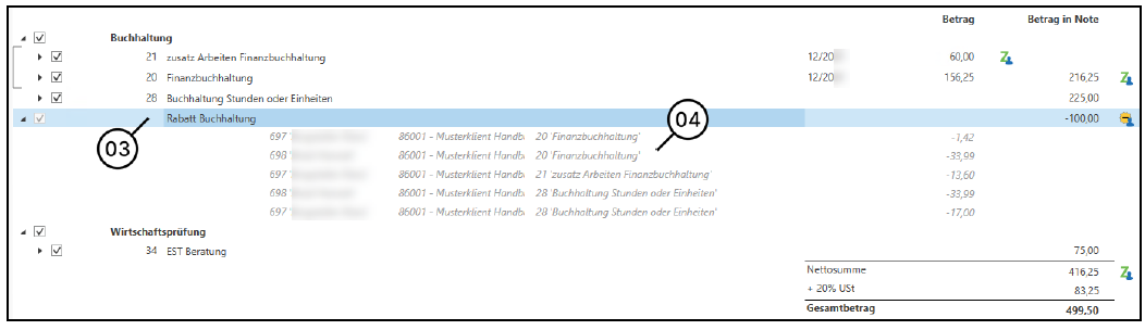 Werden im Zuge der Notenerstellung Pauschalen und Leistungen verrechnet, wird der Rabatt der Pauschale auf die Verrechnungsgruppe verteilt und der der Leistung auf die jeweiligen Tätigkeiten.