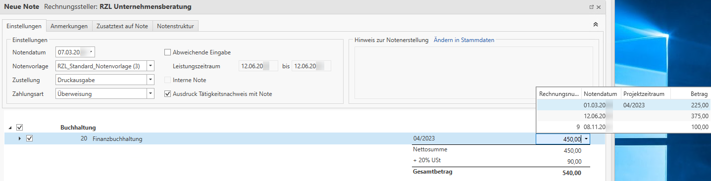 Im Zuge der Notenerstellung haben Sie die Möglichkeit sich die letzten drei abgerechneten Beträge einer bestimmten Tätigkeit anzeigen zu lassen und in die Note zu übernehmen. Vom Rückblick ausgenommen sind Notenzeilen von internen und gutgeschriebenen Noten sowie Gutschriften.